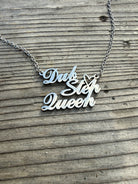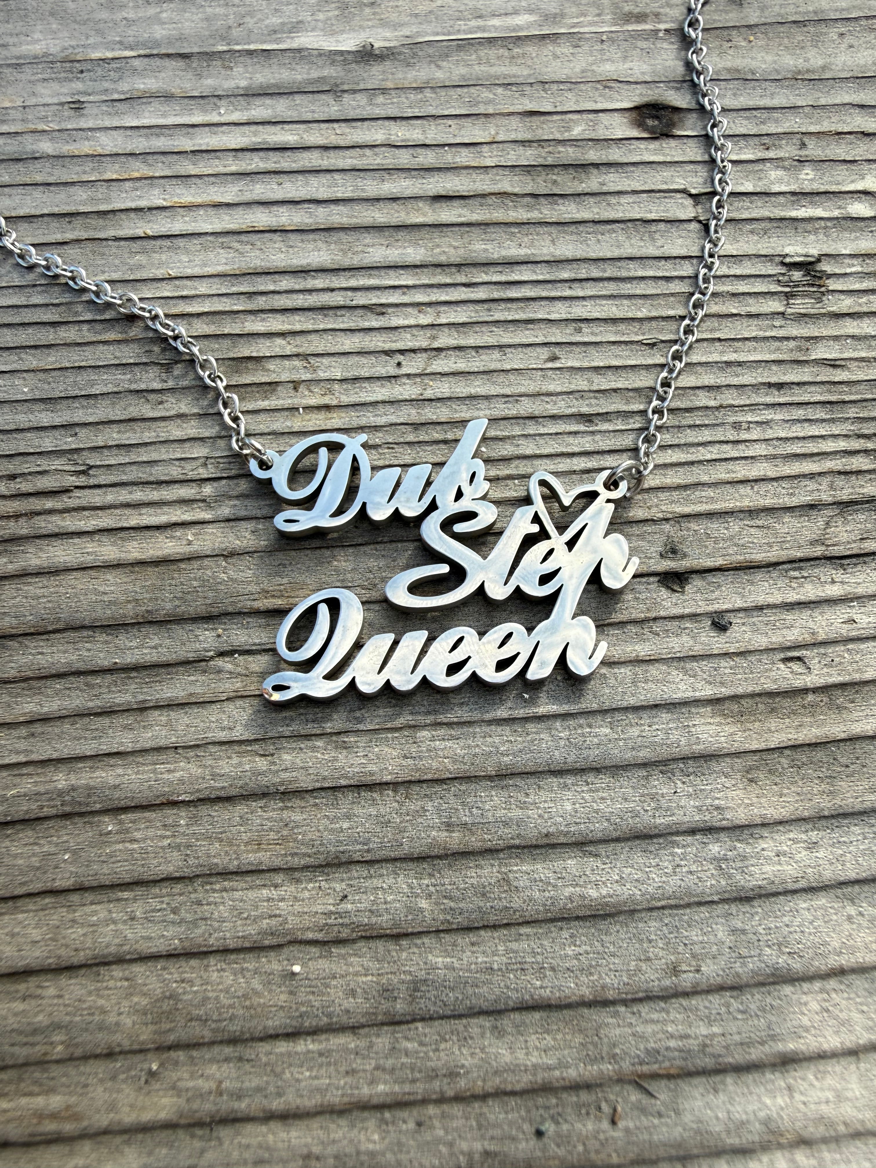 Heavy bass, filthy drops, main-character energy. The Dub Step Queen Necklace is made for those who rule the rail, feel the music in their bones, and never miss a drop. Featuring bold script lettering with a heart detail, this piece is a crown for the dance floor.