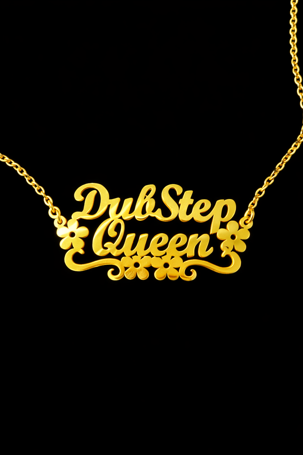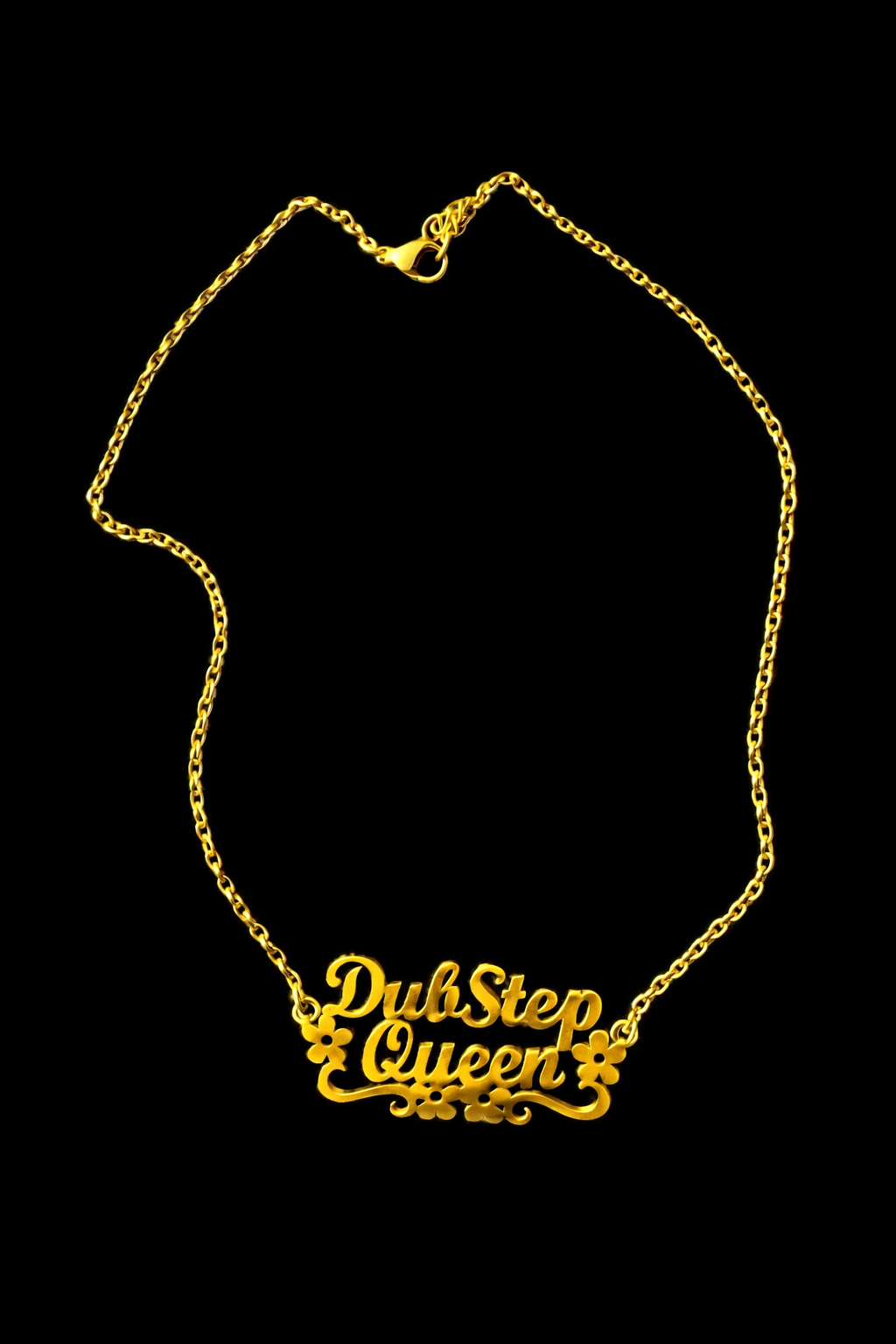 For the bass lovers, rail riders, and dancefloor royalty. The Dubstep Queen necklace is a bold gold-tone script piece with delicate floral details, made to celebrate your love for heavy drops and high-energy nights.