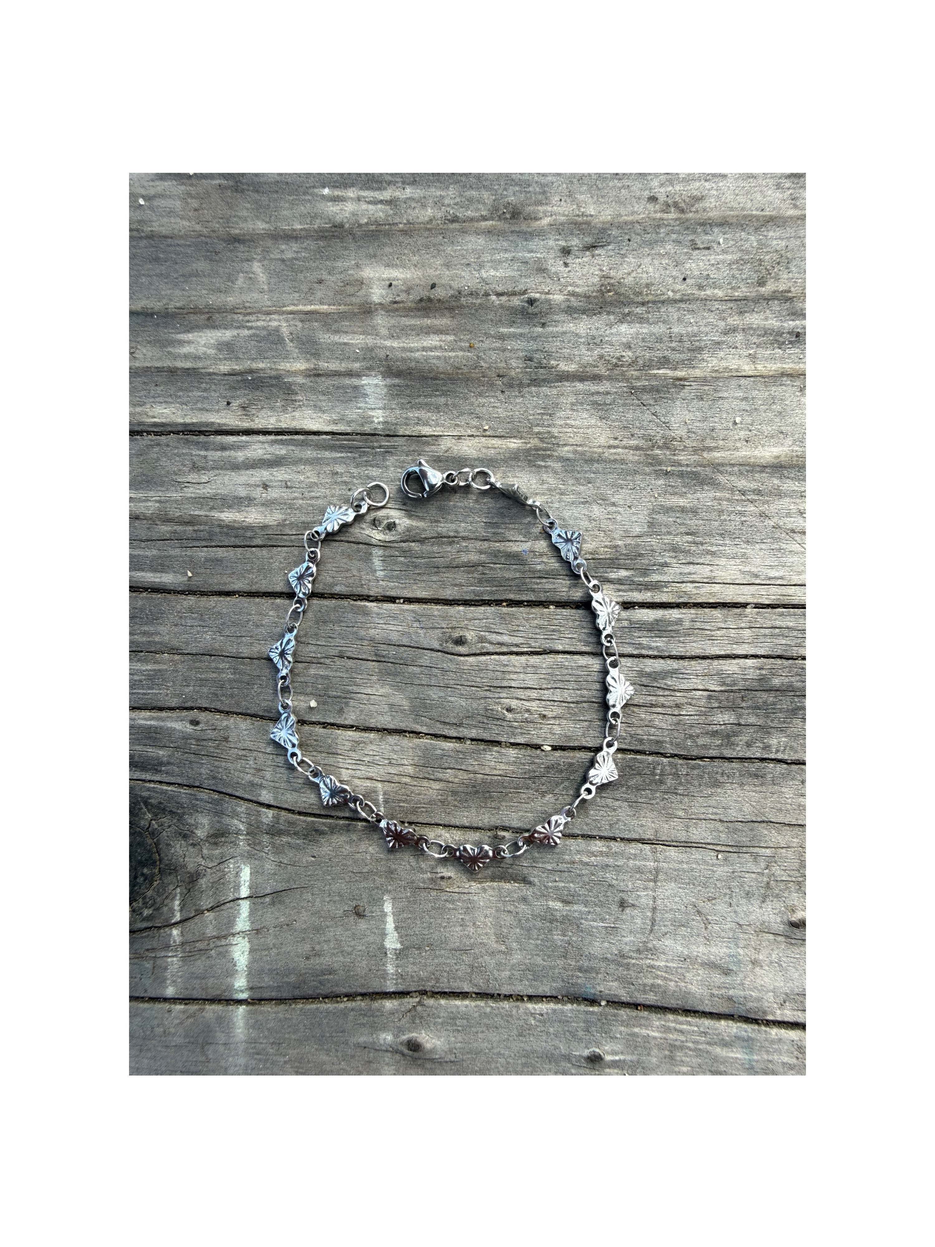 Delicate but durable, the Stainless Steel Starburst Heart Bracelet is made entirely from stainless steel for everyday wear. Featuring a continuous chain of small heart-shaped links with subtle starburst detailing, this piece carries a soft romantic energy while staying sleek and modern.