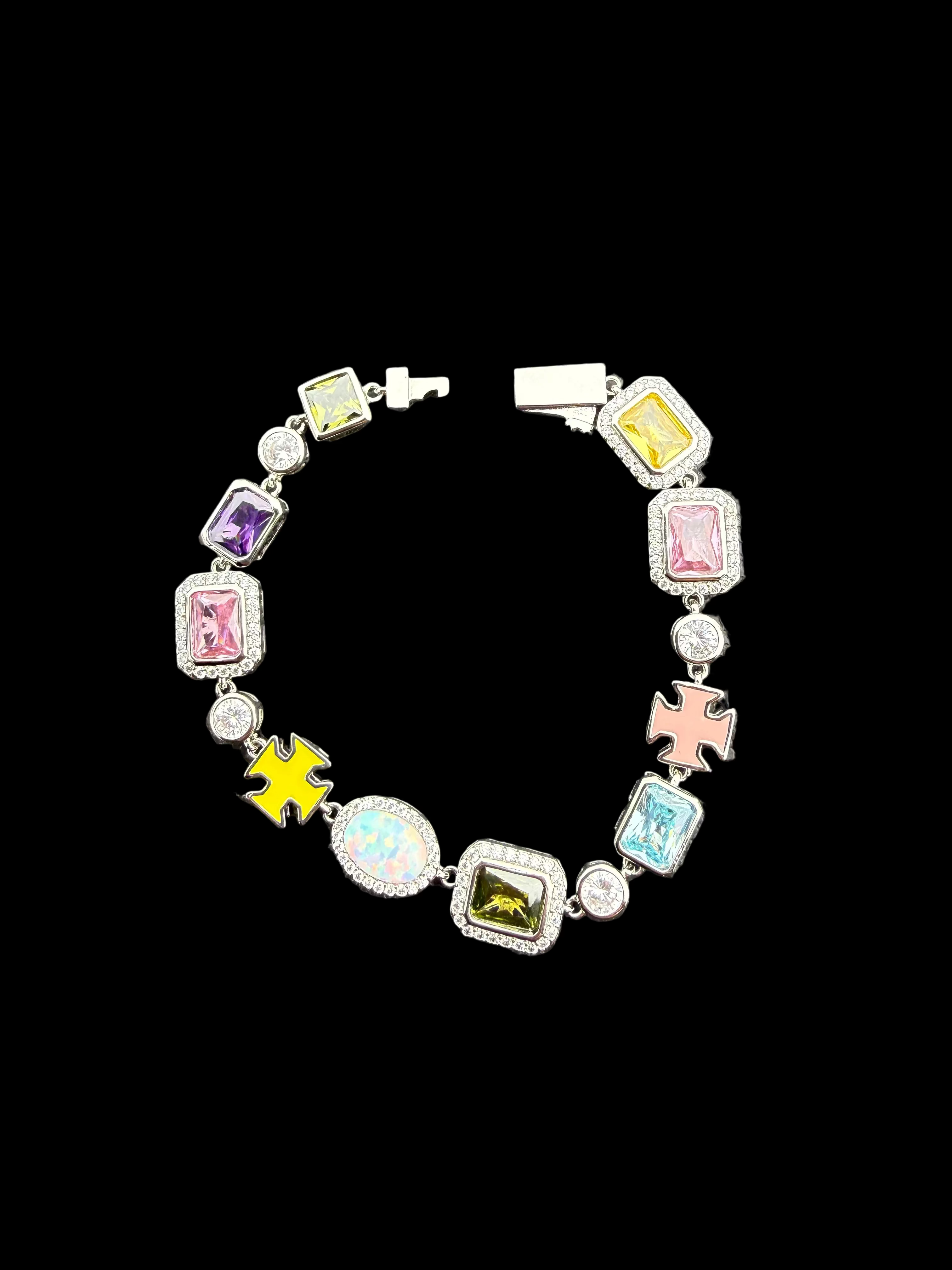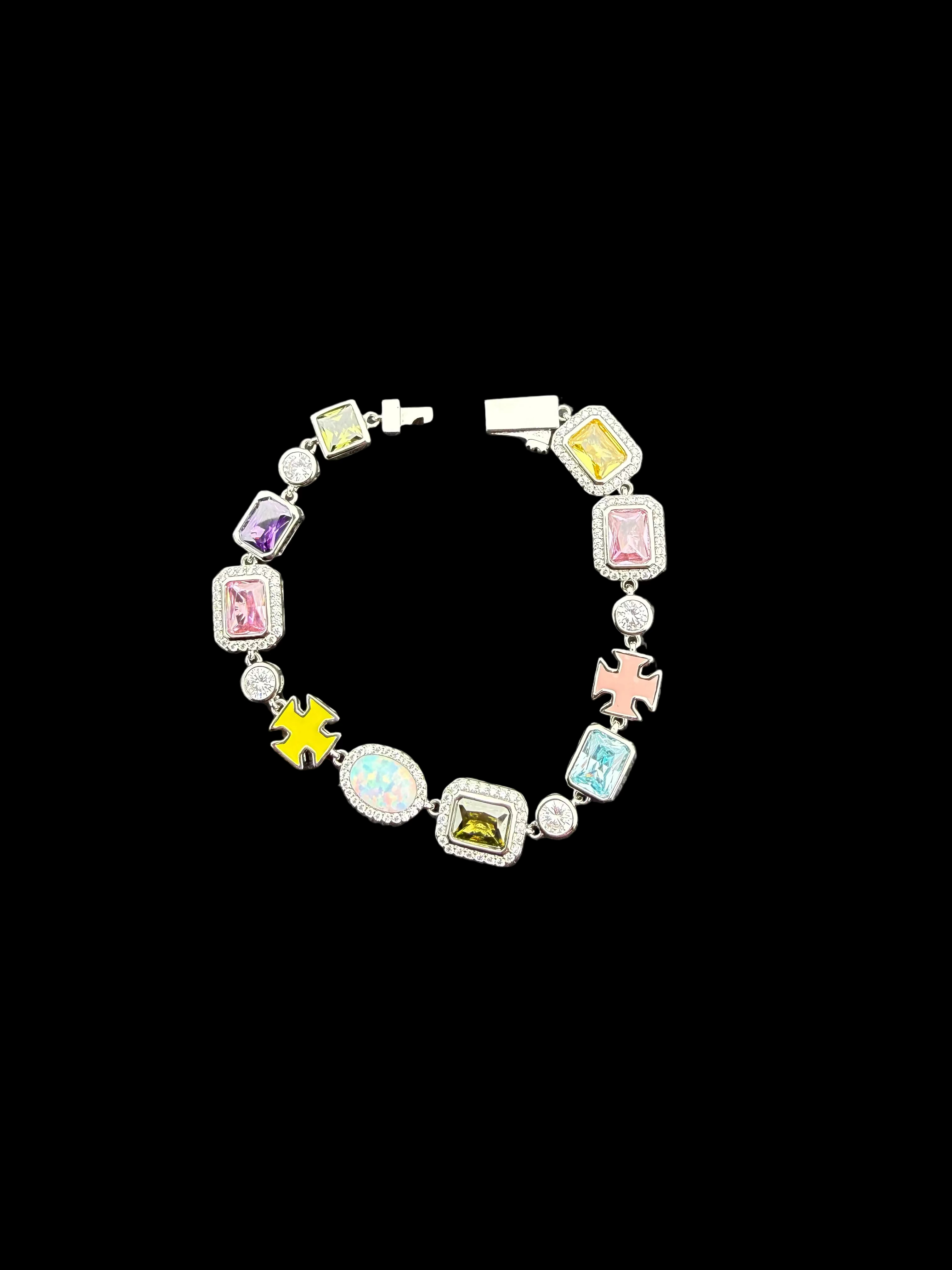 The Celestial Mosaic Bracelet is a vibrant statement piece featuring multicolored faceted stones, shimmering crystal accents, enamel cross details, and a luminous opalescent centerpiece. Each link feels intentional — like a constellation wrapped around your wrist.