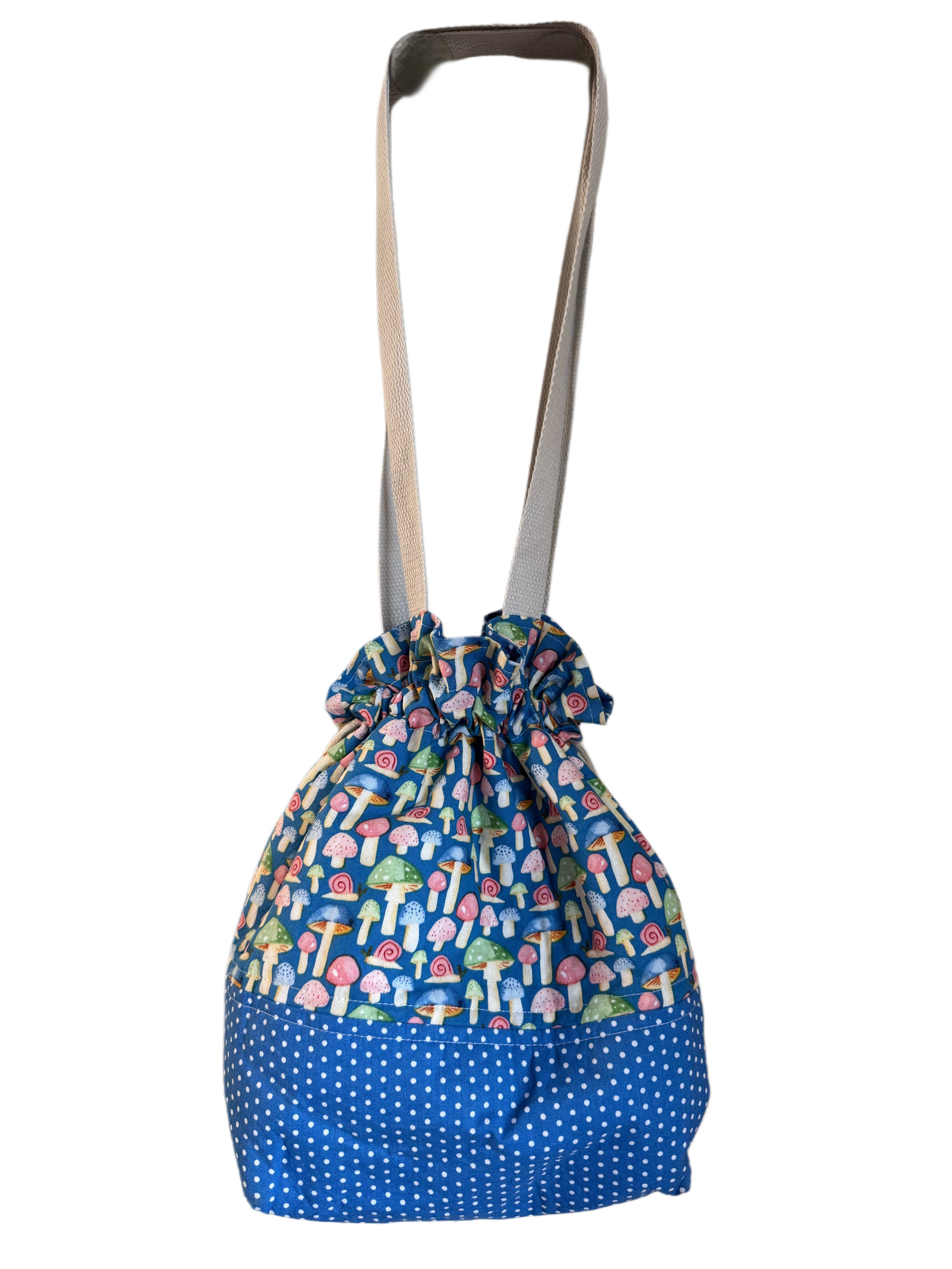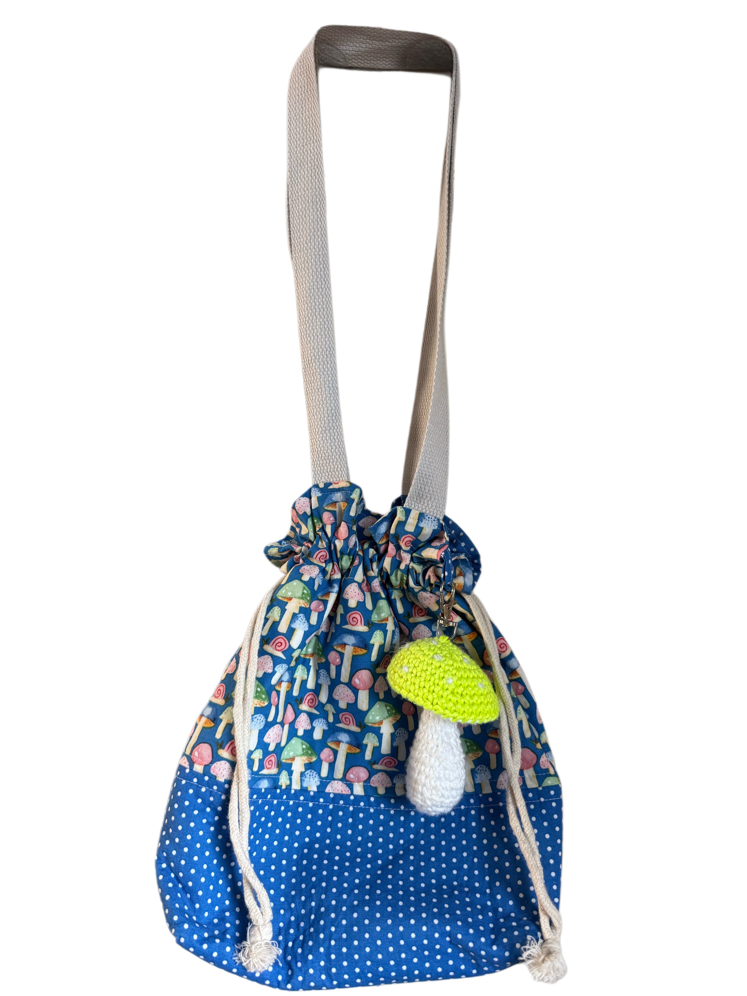 The Mushroom Sprite Drawstring Bag feels like it belongs in a fairy forest. Featuring whimsical mushroom patterns and a soft drawstring closure, this handmade cotton bag is both functional and enchanting.