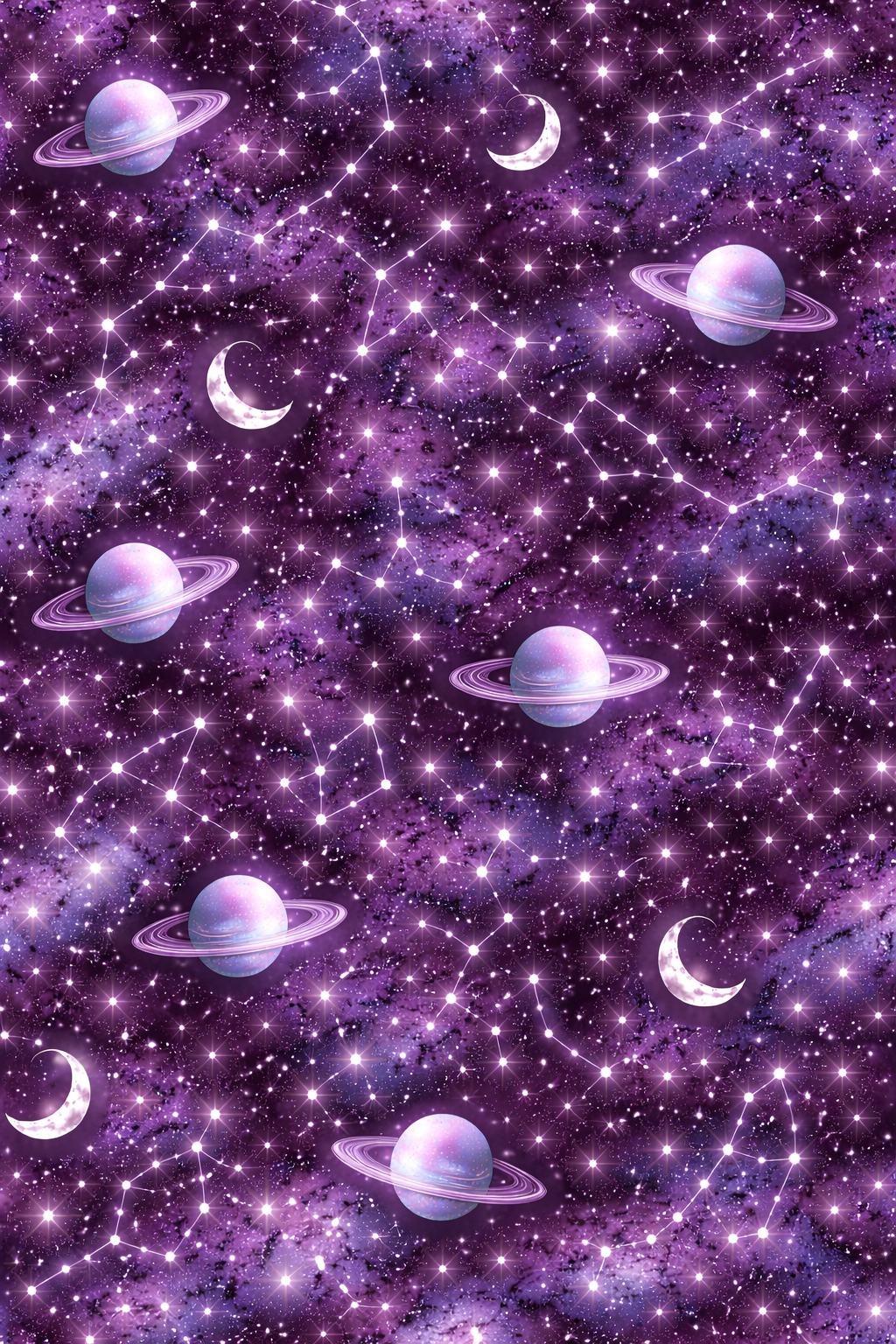 Delicate astrology constellations weave through the design, connecting points of light across the fabric like cosmic maps written in the sky. Saturn-like planets float gently throughout—small, luminous, and abundant—adding a sense of movement and balance without overpowering the scene. Crescent moons and subtle nebula textures enhance the mystical atmosphere, creating a pattern that feels expansive, calming, and otherworldly.