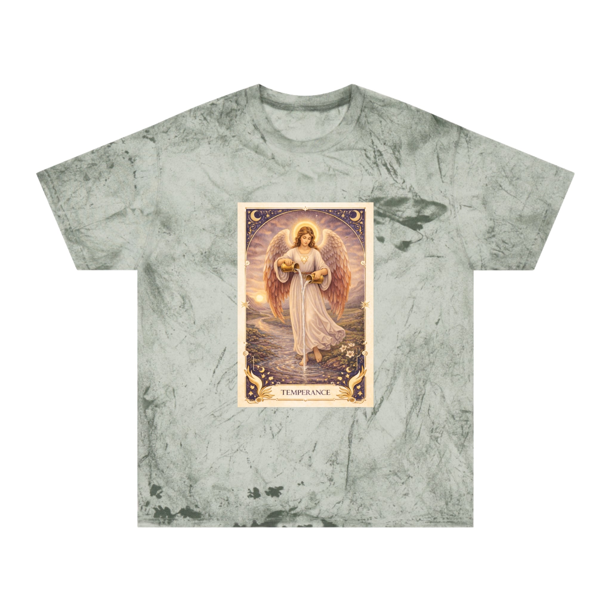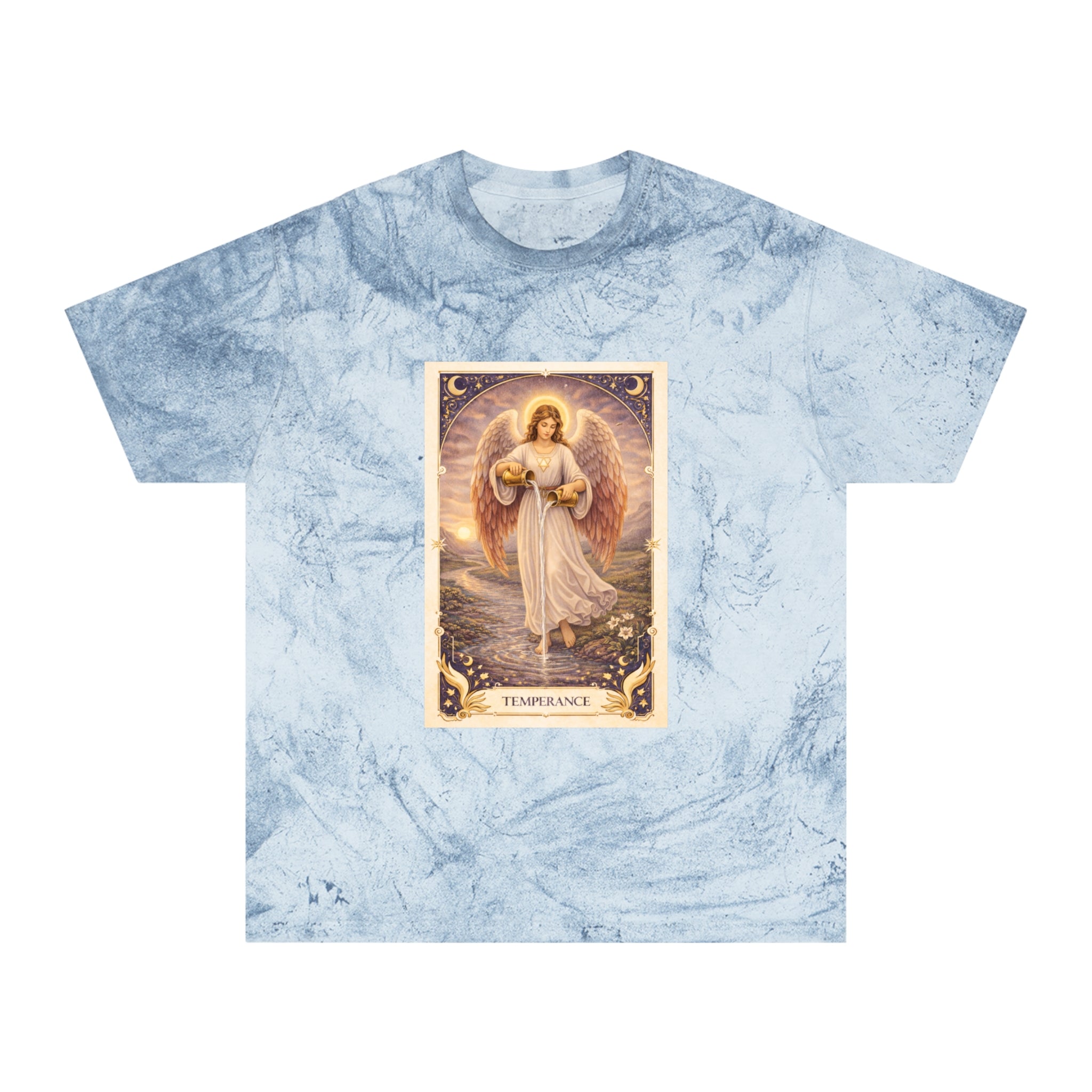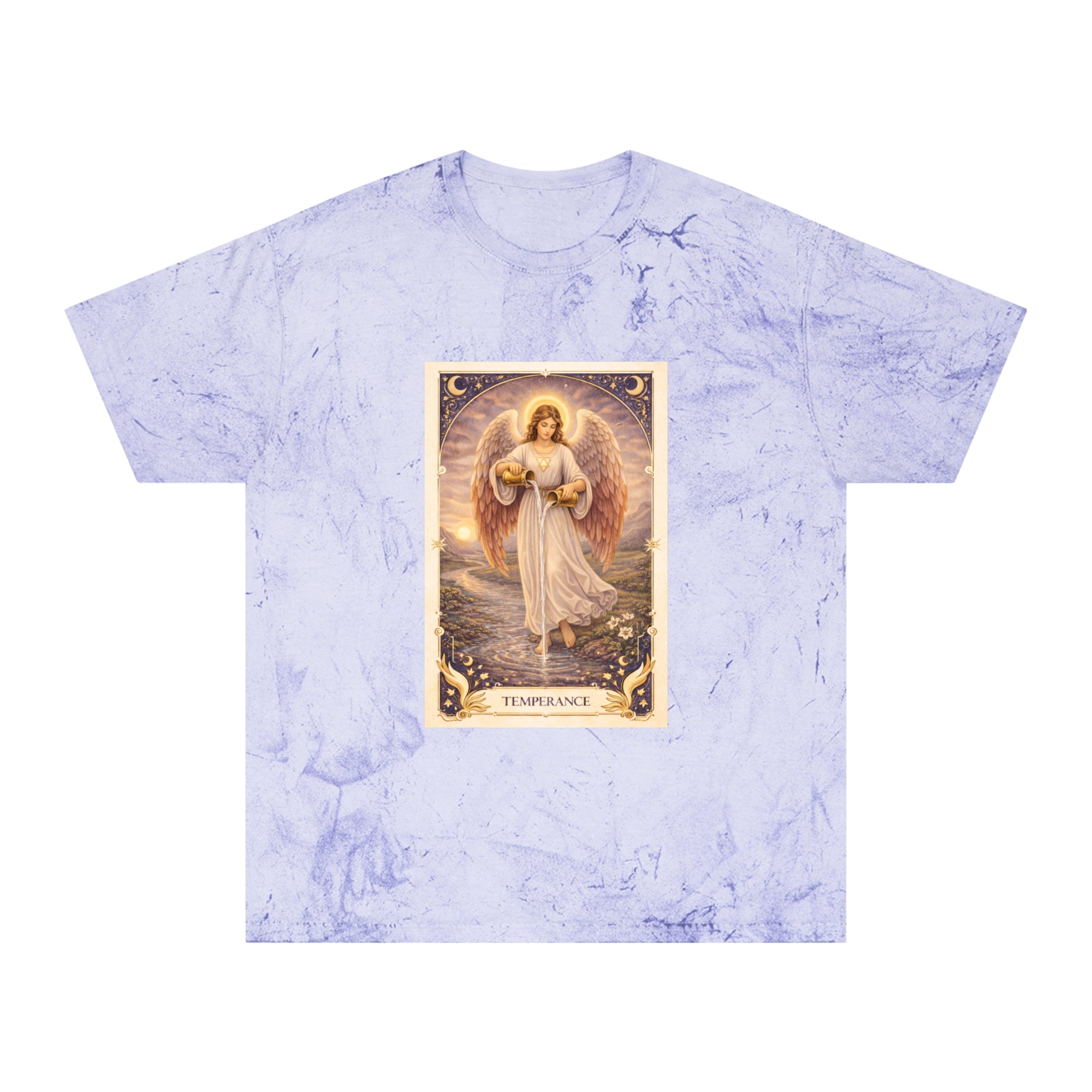 Printed on a Comfort Colors Color Blast tee, this piece carries a serene, grounding energy. The garment-dyed, marbled fabric gives each shirt a unique, organic character, echoing the card’s message that harmony is not rigid — it is fluid, lived, and personal.