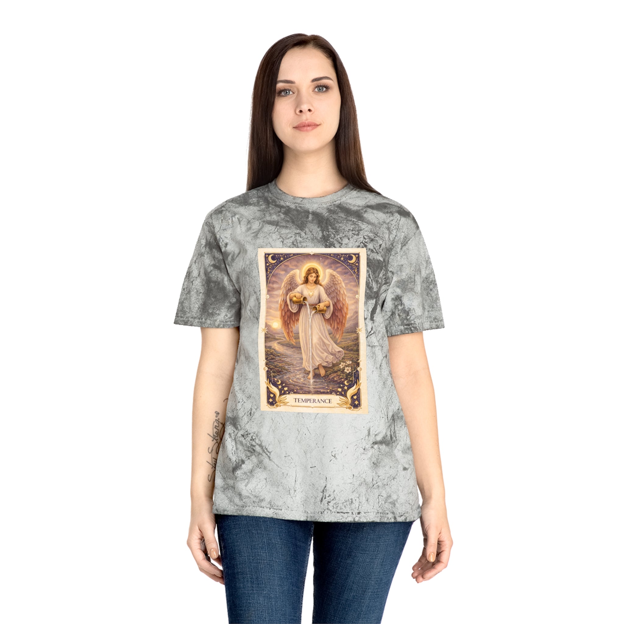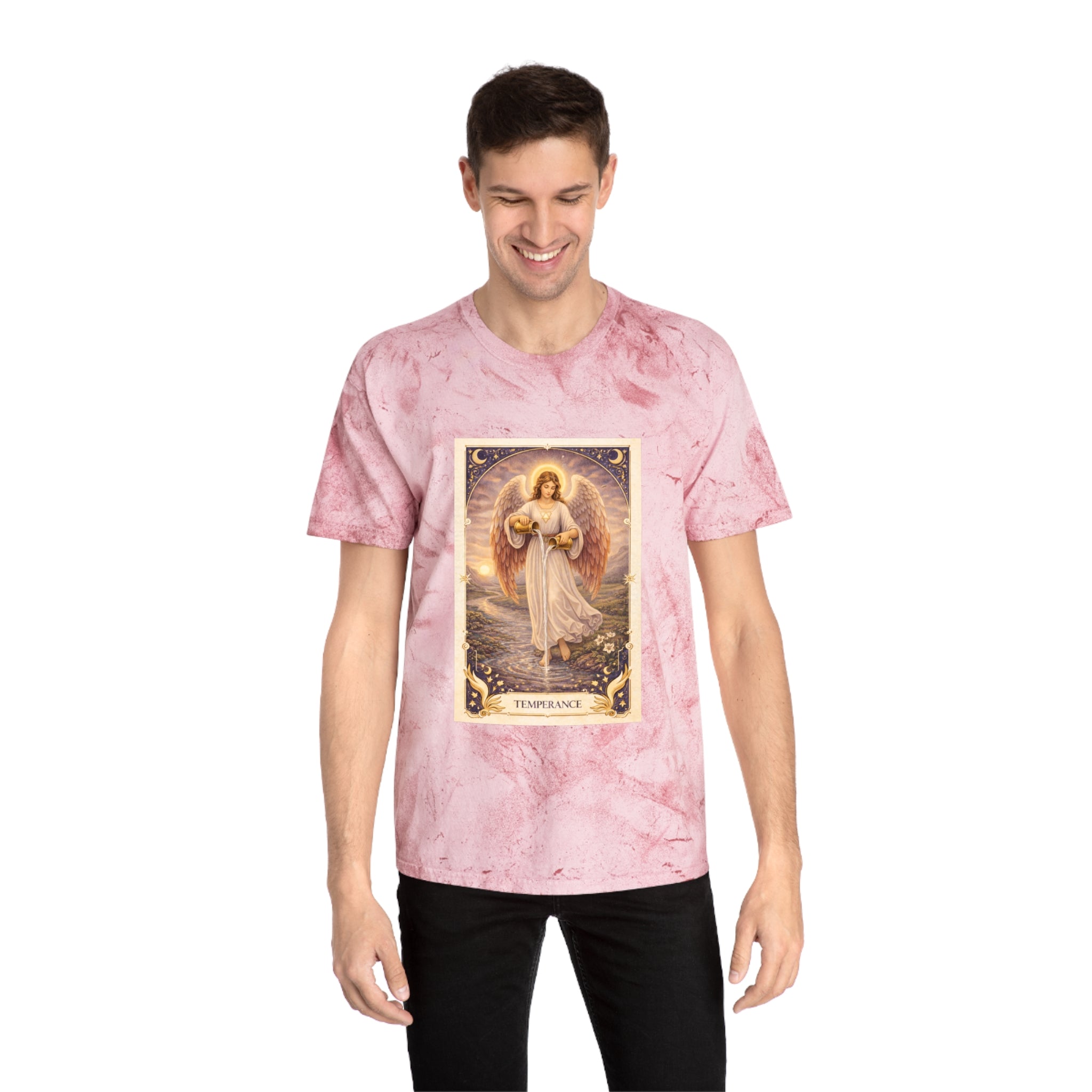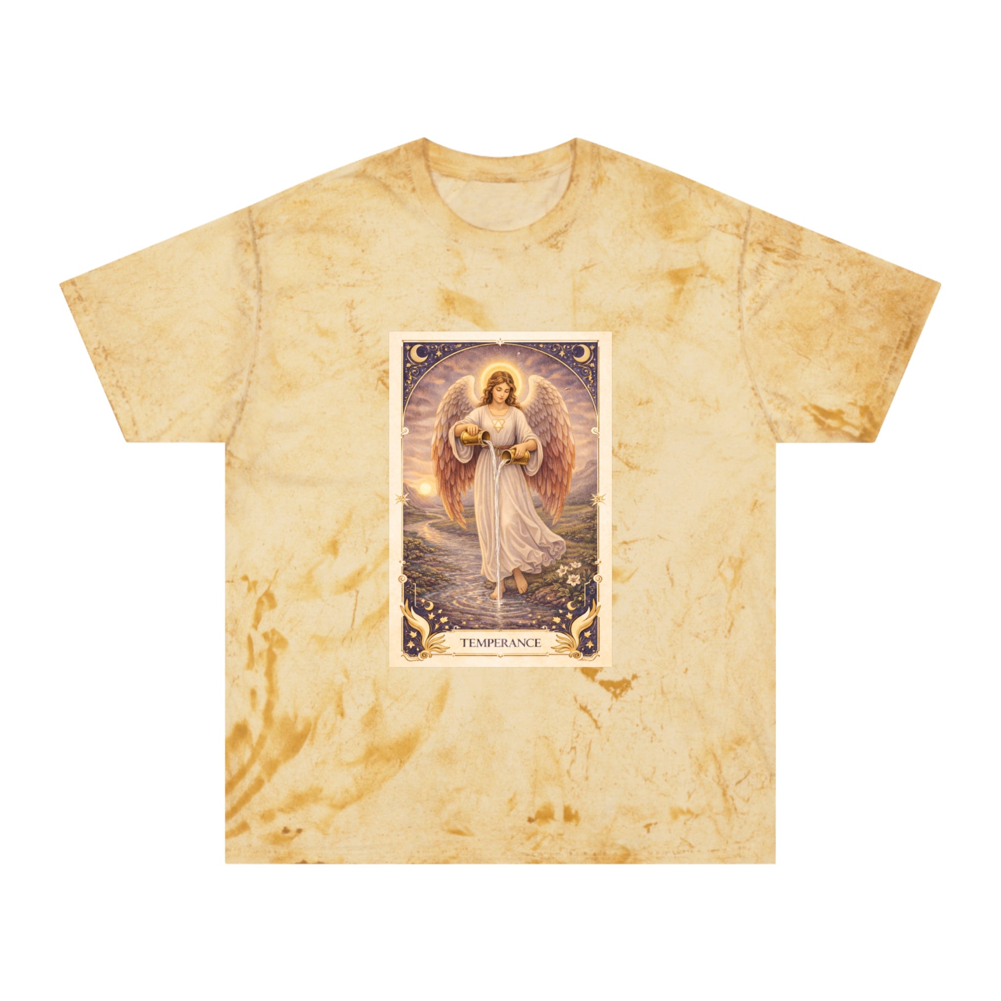 Printed on a Comfort Colors Color Blast tee, this piece carries a serene, grounding energy. The garment-dyed, marbled fabric gives each shirt a unique, organic character, echoing the card’s message that harmony is not rigid — it is fluid, lived, and personal.