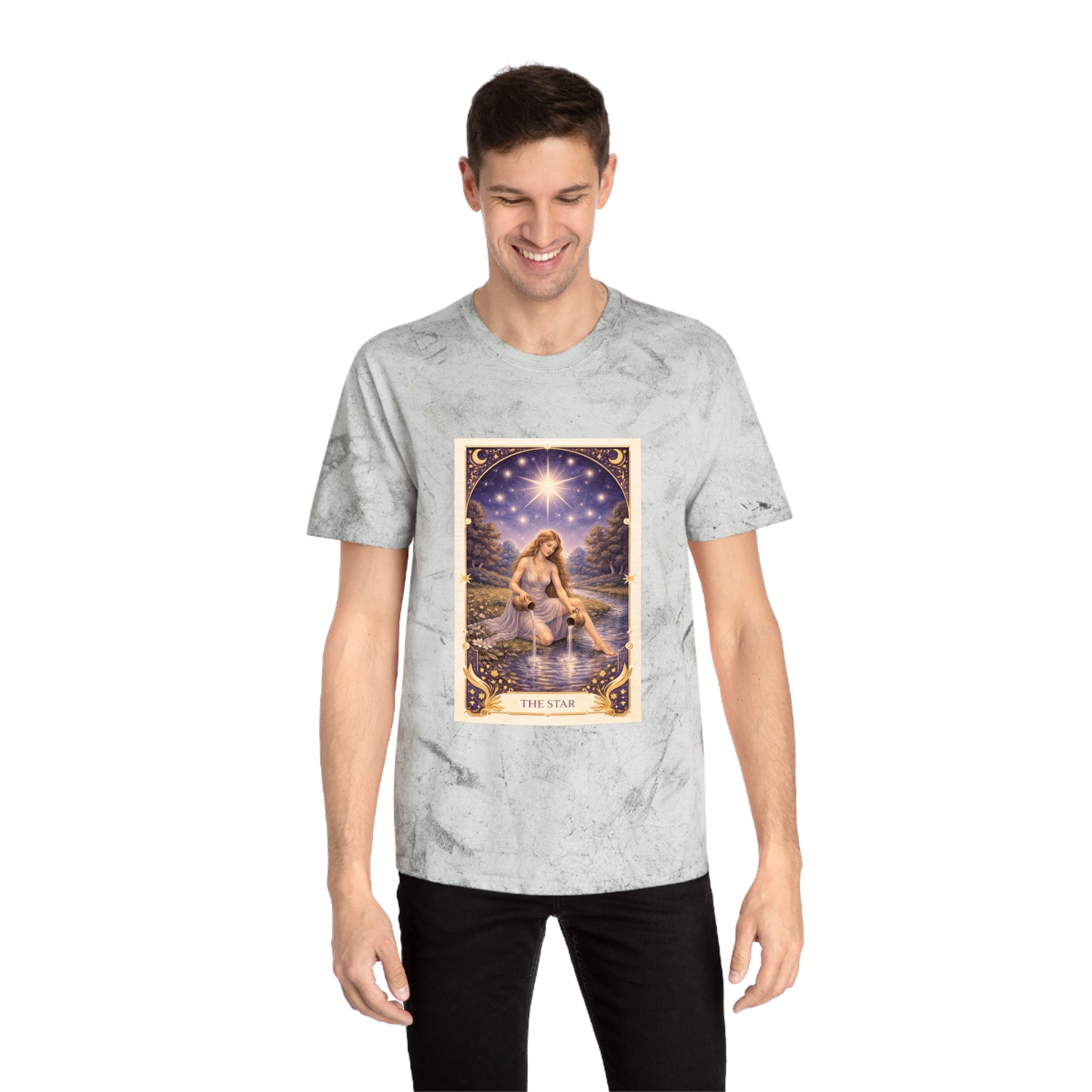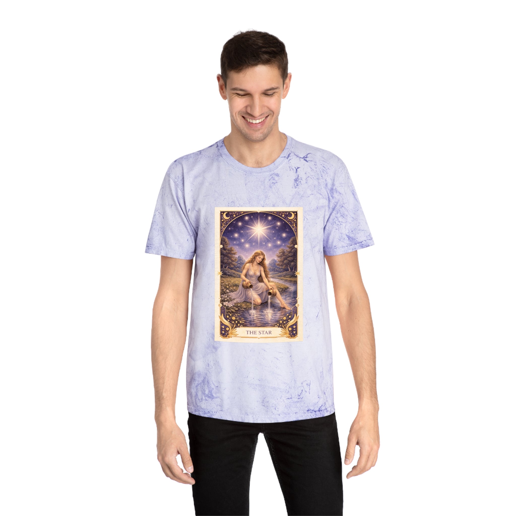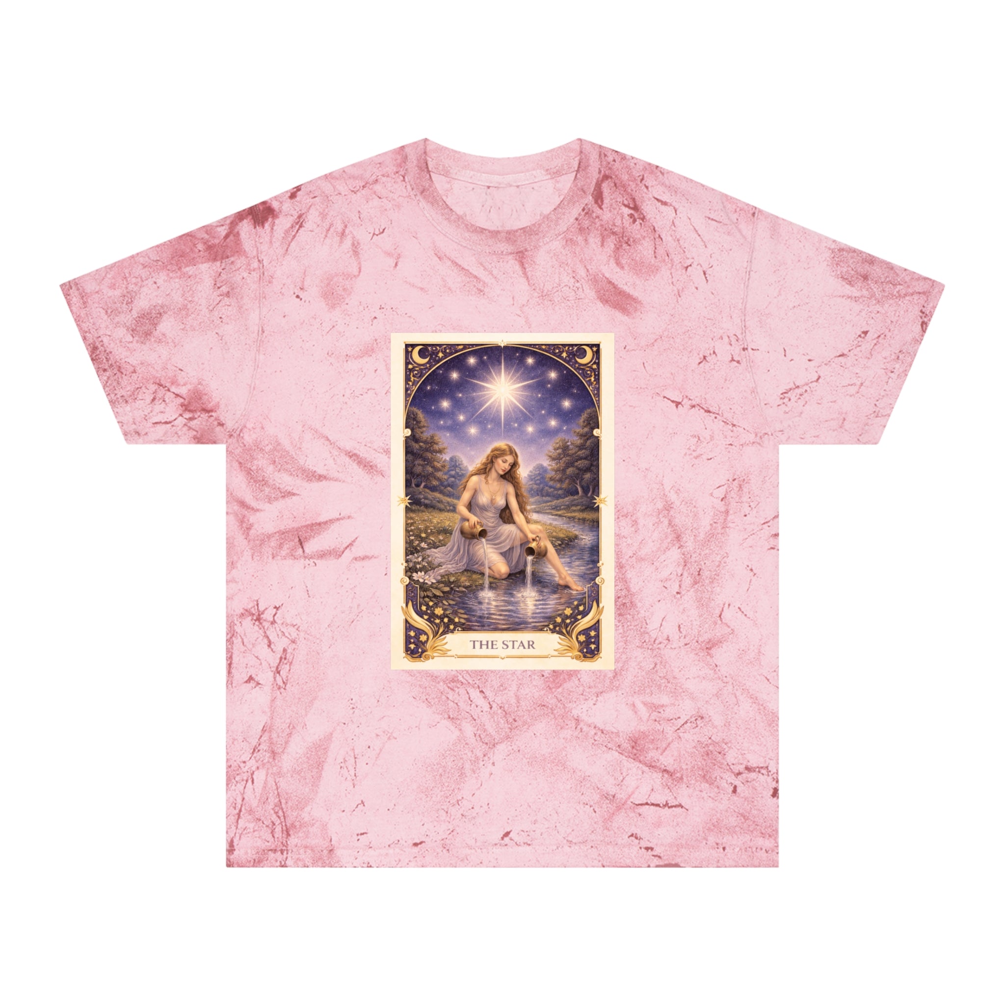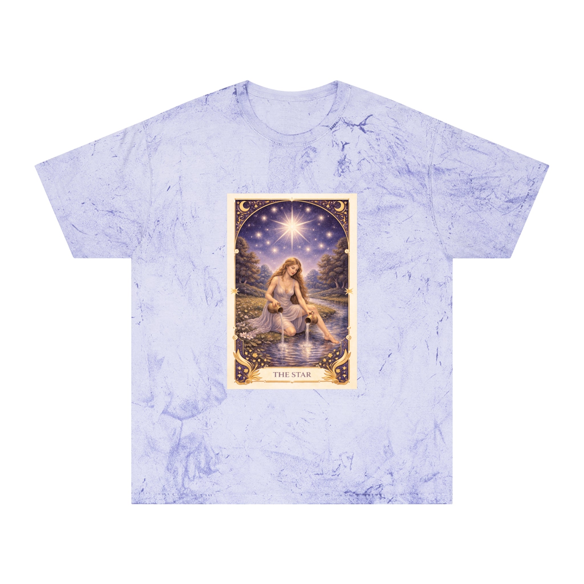 Printed on a Comfort Colors Color Blast tee, this piece carries a peaceful, luminous energy. The garment-dyed, marbled fabric gives each shirt a celestial, worn-in feel — no two are exactly alike, mirroring the personal journey of healing and self-trust.
