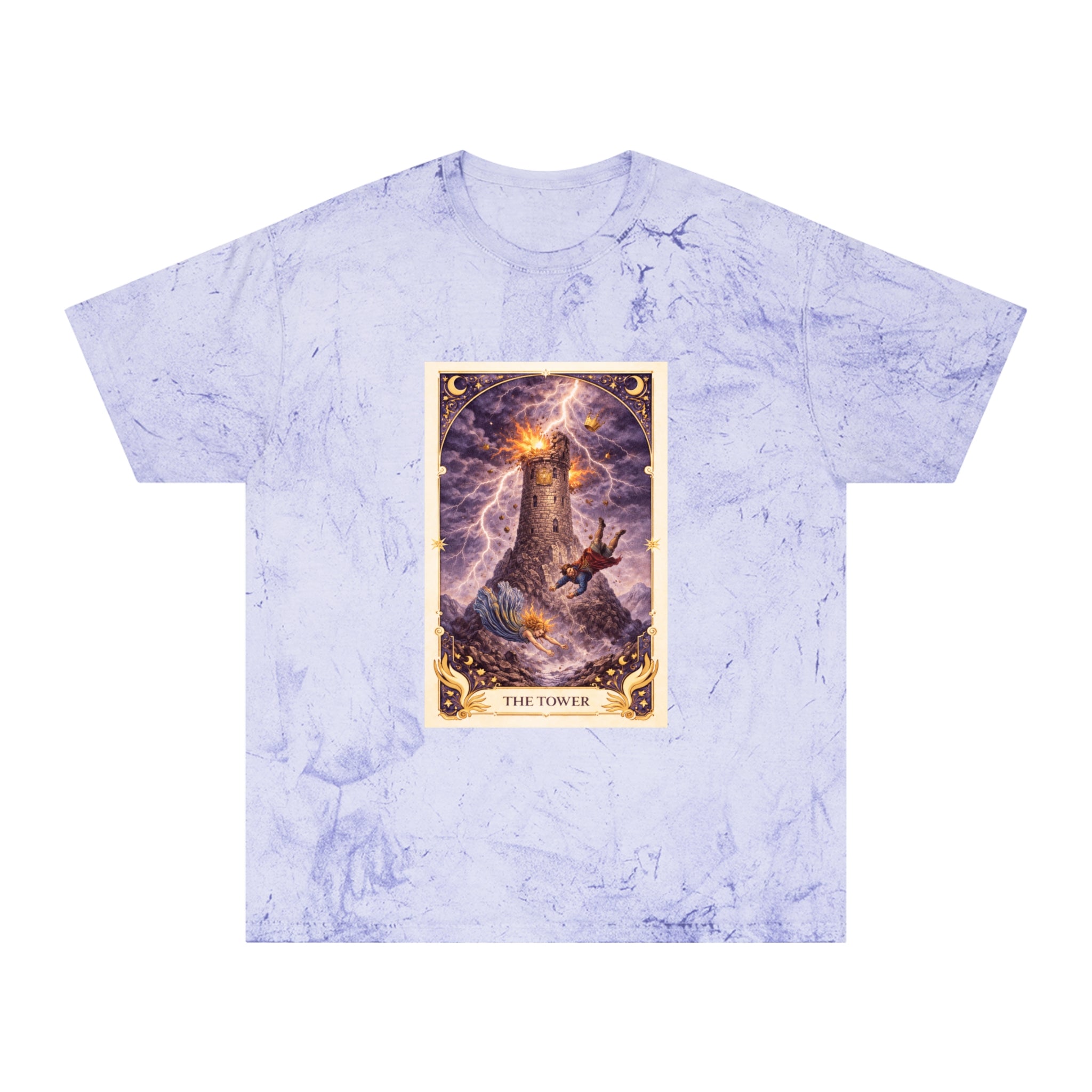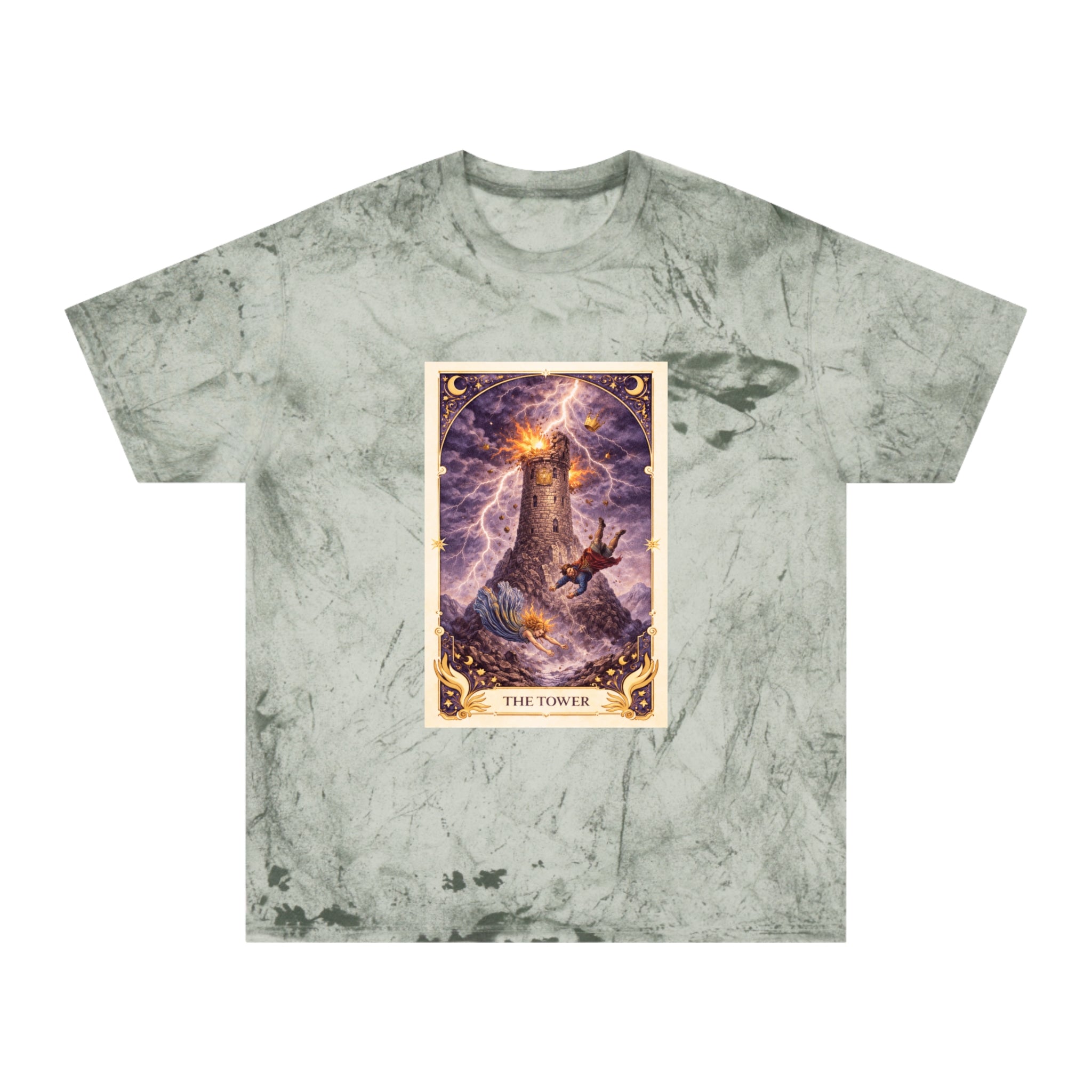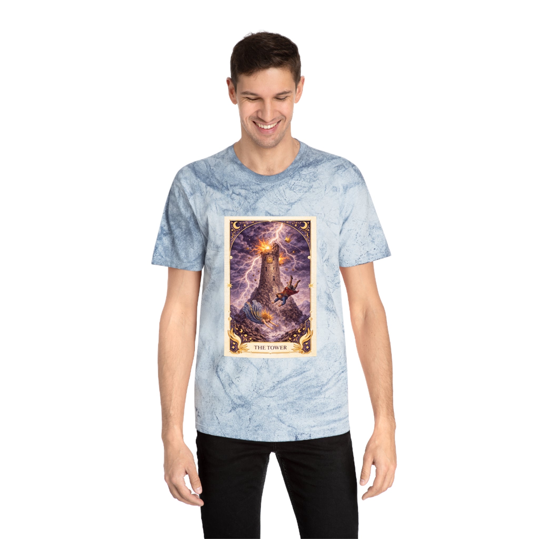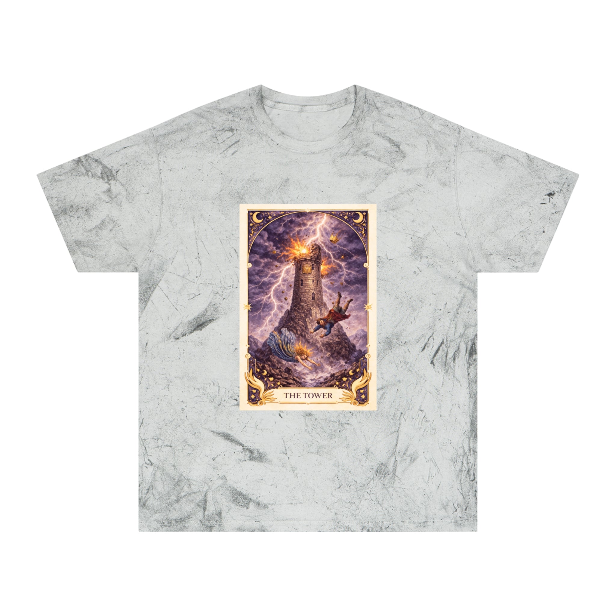 Printed on a Comfort Colors Color Blast tee, this piece carries raw, electric energy. The garment-dyed, marbled texture mirrors the unpredictability of the Tower itself — no two shirts are exactly alike, just as no awakening unfolds the same way twice. The worn-in feel grounds the intensity, turning upheaval into something embodied and real.