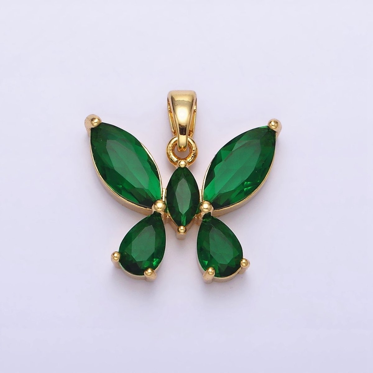 The Emerald Ascension Butterfly Pendant features a radiant butterfly design adorned with rich green cubic zirconia stones, set in luminous 16K gold-filled brass. Butterflies represent rebirth, evolution, and spiritual awakening, while emerald-green tones are associated with the heart chakra, renewal, and prosperity.