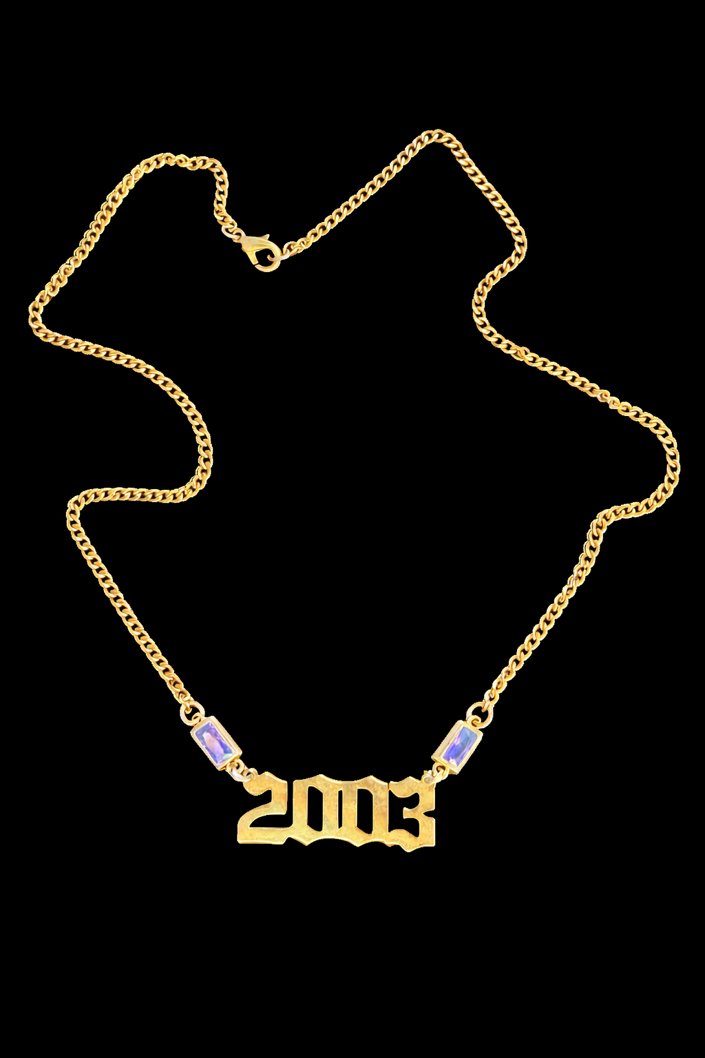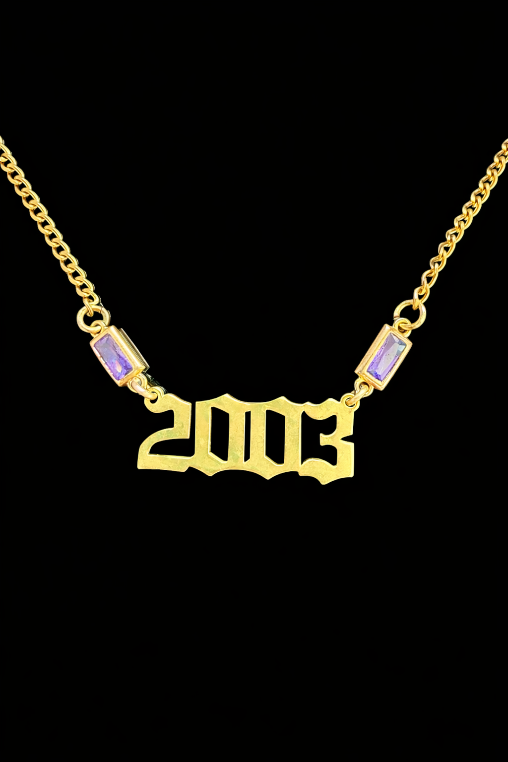 The 2003 Necklace is a tribute to a year that shaped a generation. Designed in bold gothic numerals and accented with soft lavender stones, this piece captures nostalgia, identity, and personal history in wearable form.