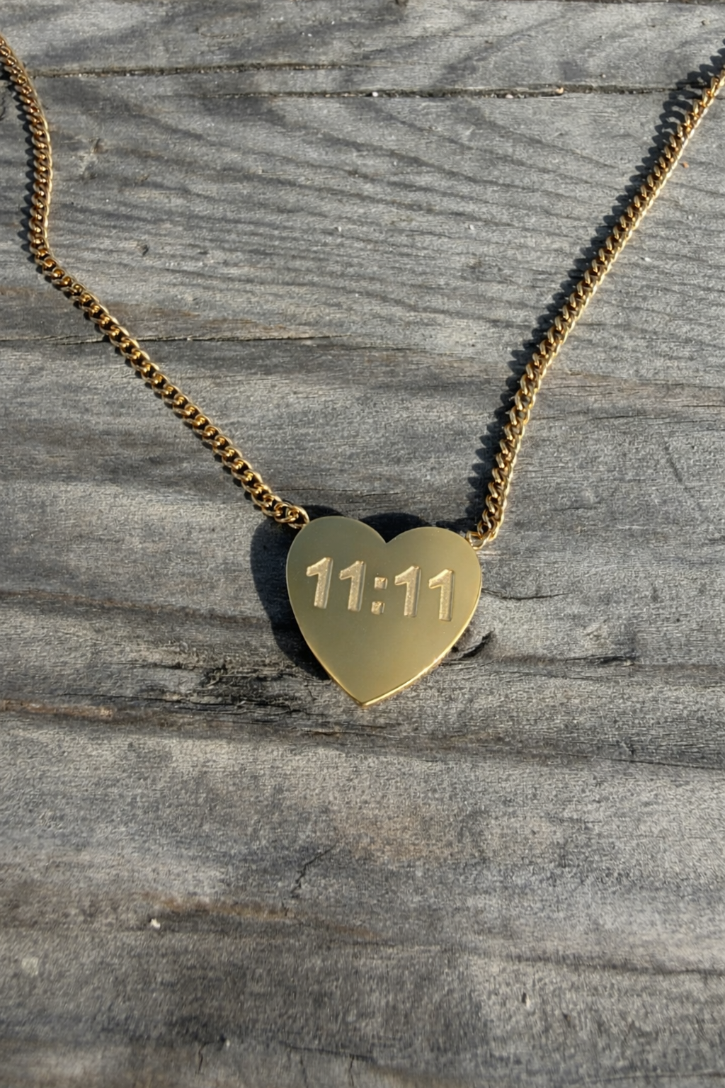Crafted in a polished gold finish with a bold engraved 11:11 centered on a heart-shaped pendant, this piece represents divine timing, synchronicity, and energetic alignment. The heart amplifies the frequency of love, intention, and soul connection — making it more than jewelry. It’s a daily activation.