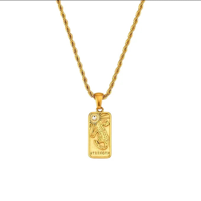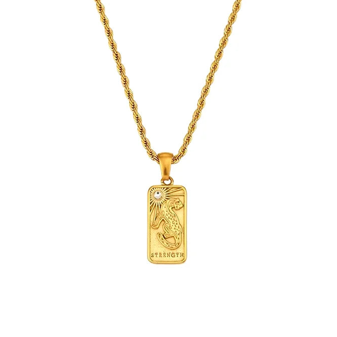 The Golden Strength Necklace embodies the essence of the Strength tarot card, symbolizing inner courage and resilience. This gold-plated necklace features a graceful figure taming a lion, representing the harmonious balance between compassion and strength. An elegant accessory for those seeking to channel their inner fortitude and embrace life’s challenges with grace.