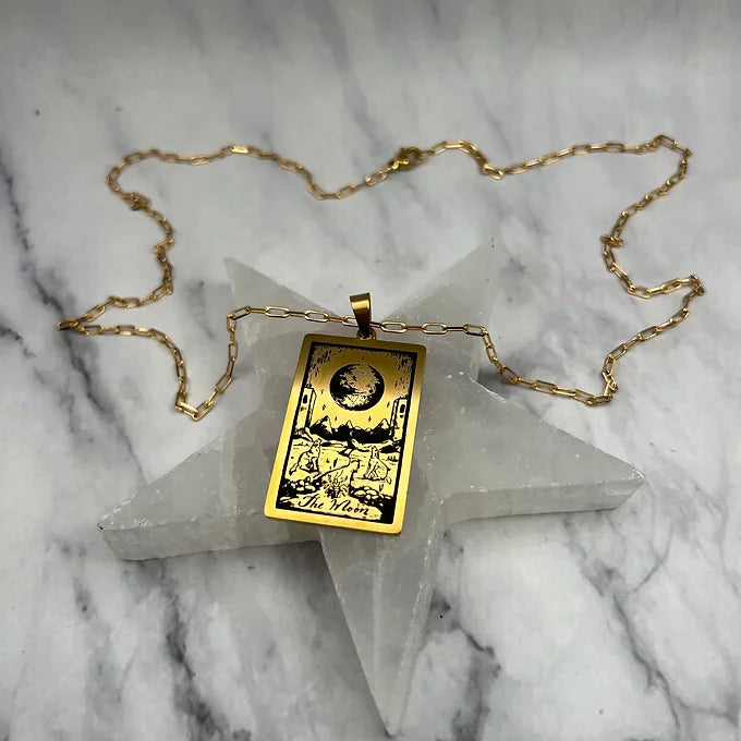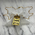 A stunningly polished tarot card necklace, perfect for all occult lovers! The perfect gift and a must have. Sitting on a durable 18" 14 K gold filled paper clip chain, this necklace is sure to last through all of your favorite moments.