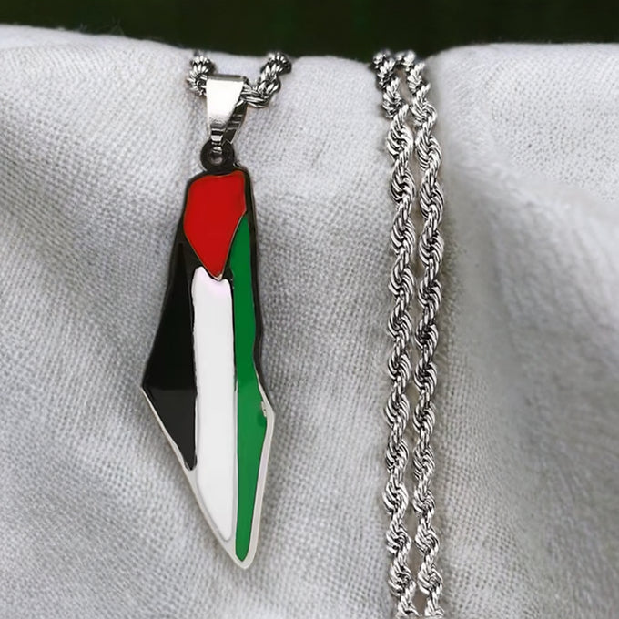 Palestine Map Pendant Necklace crafted from durable stainless steel, available in silver and gold. Designed with excellent craftsmanship using cutting, polishing, and plating for a refined finish. Features a meaningful Palestine map design symbolizing freedom, equality, and peace.