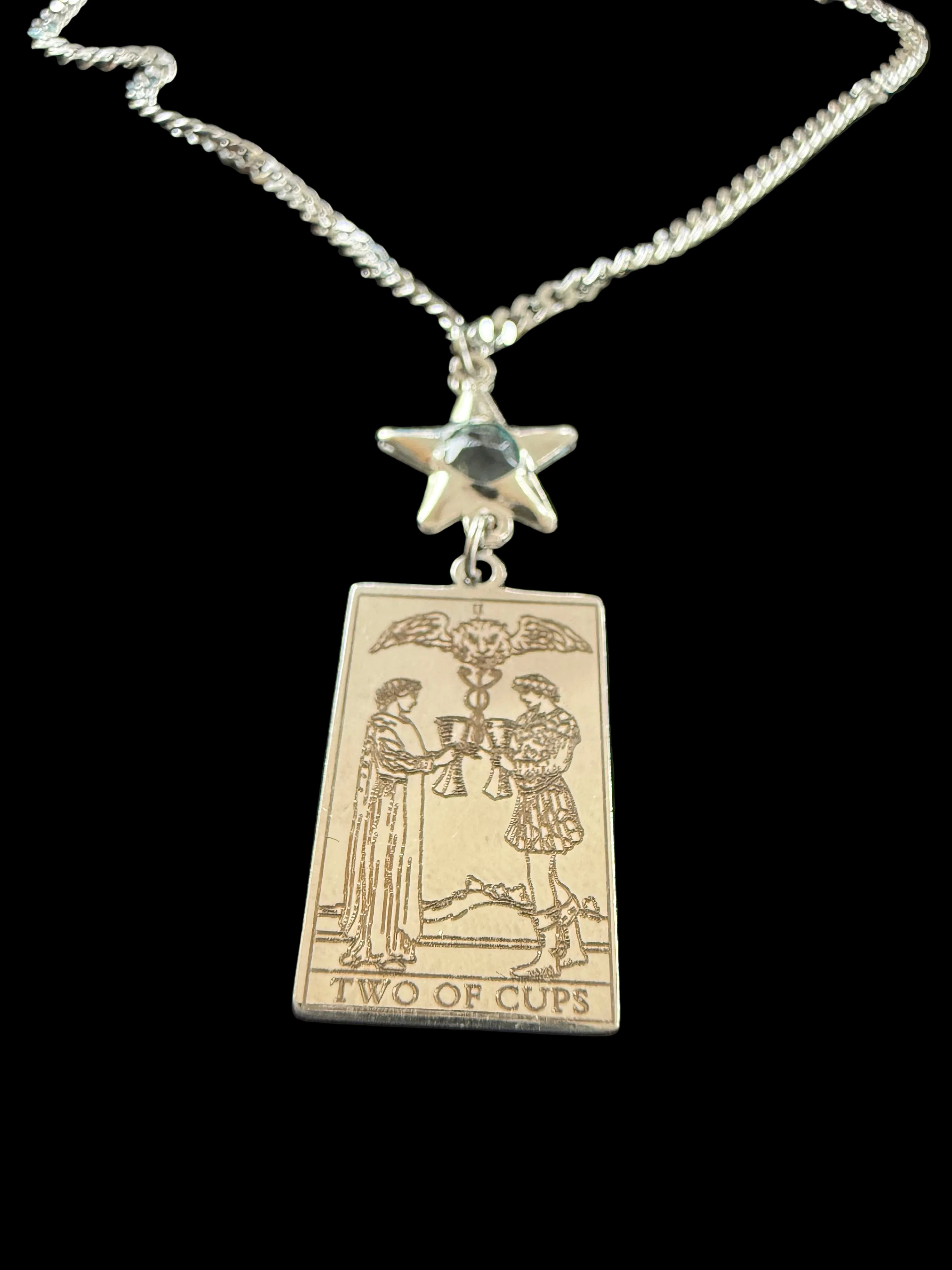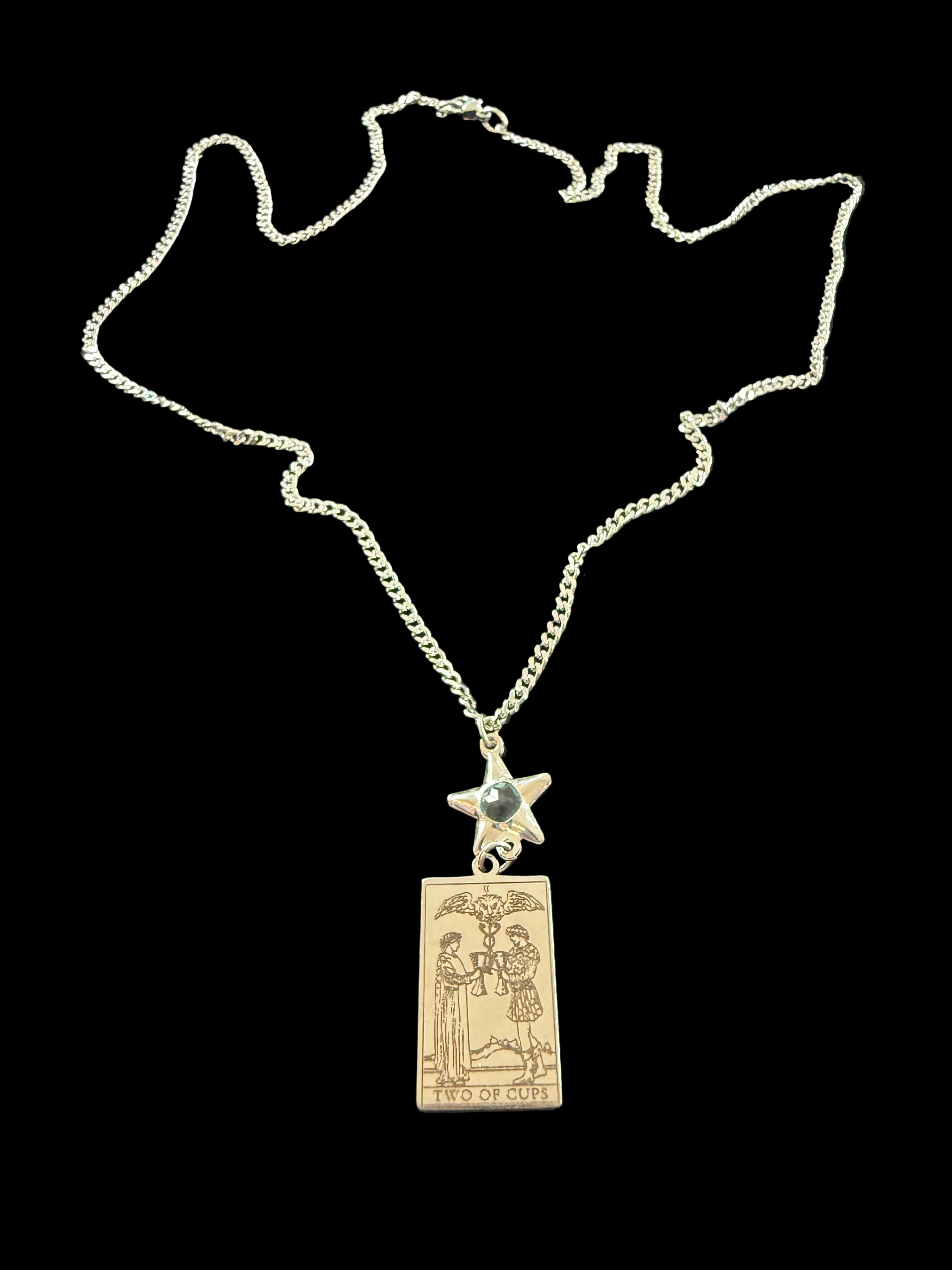 This pendant features an engraved Two of Cups tarot design paired with a star charm accent for a subtle celestial touch. Crafted from durable stainless steel, it is tarnish-resistant, long-lasting, and designed for everyday wear. The chain has a substantial, high-quality feel while remaining comfortable and versatile.