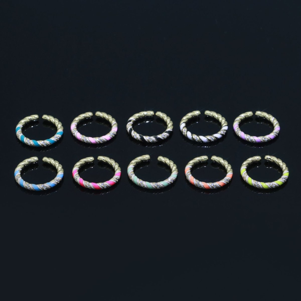 The Aurora Twist Adjustable Enamel Ring features a sleek twisted silhouette accented with vibrant enamel and subtle micro pavé sparkle. Designed to reflect movement and flow, this ring catches the light beautifully while adding a playful pop of color to a minimalist design.