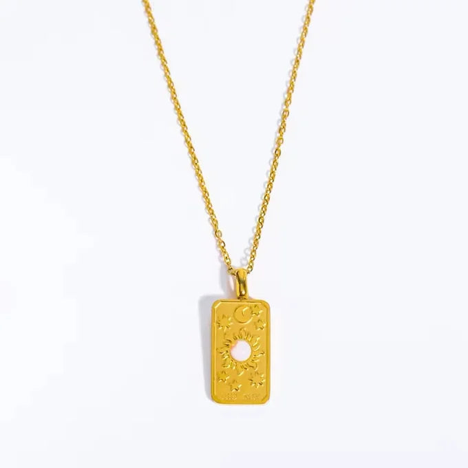 The Lunar Sunburst Pendant Necklace blends celestial elegance with timeless simplicity. Featuring a gold-plated design with intricate sun and moon engravings surrounding a luminous central accent, it symbolizes harmony and balance. Perfect for dreamers and stargazers, this versatile piece radiates cosmic charm and adds a touch of magic to any outfit.