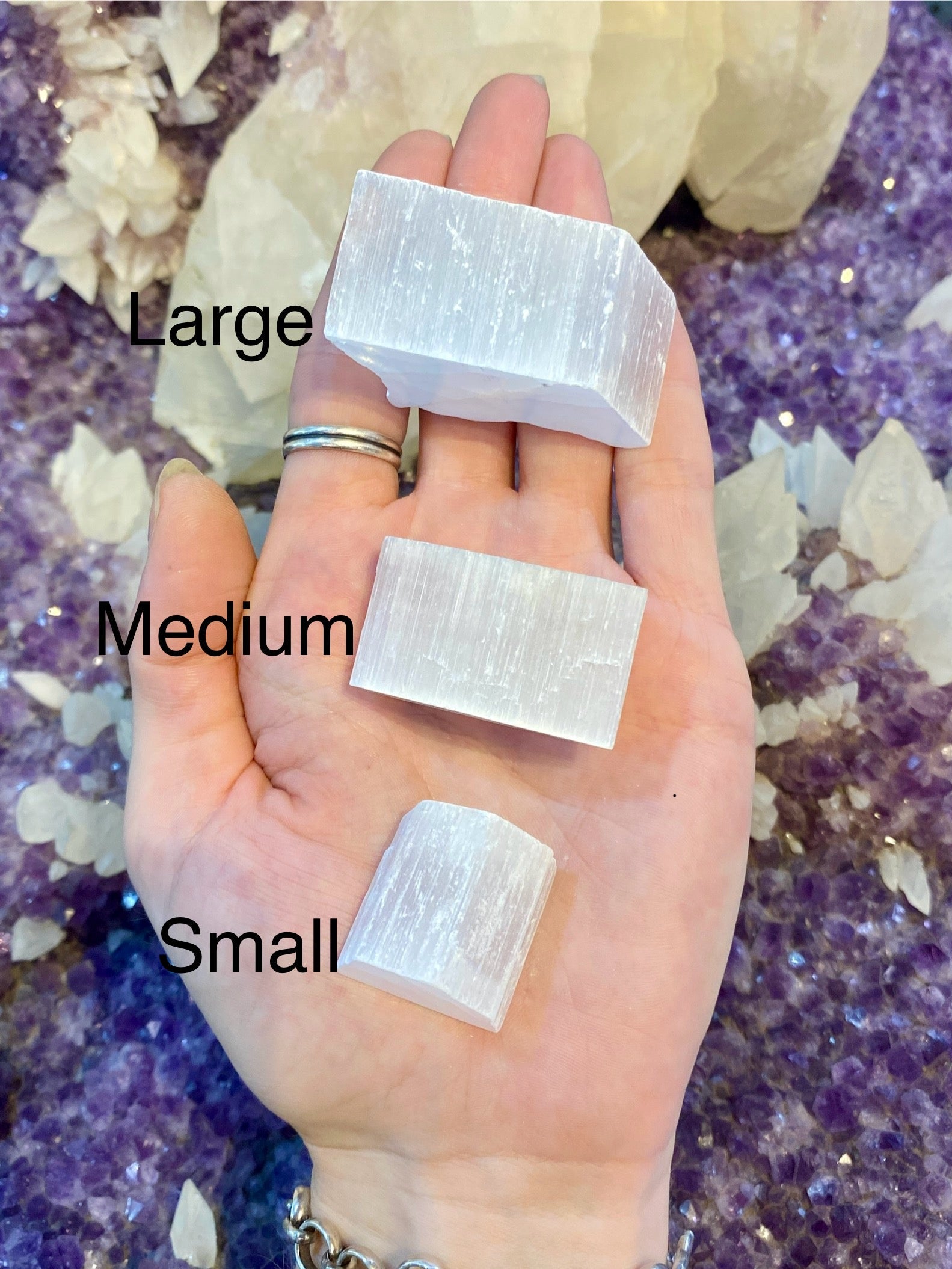 You will receive one Selenite Chunk similar in look to the photographs and videos, in the size selected from the dropdown menu.