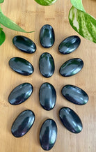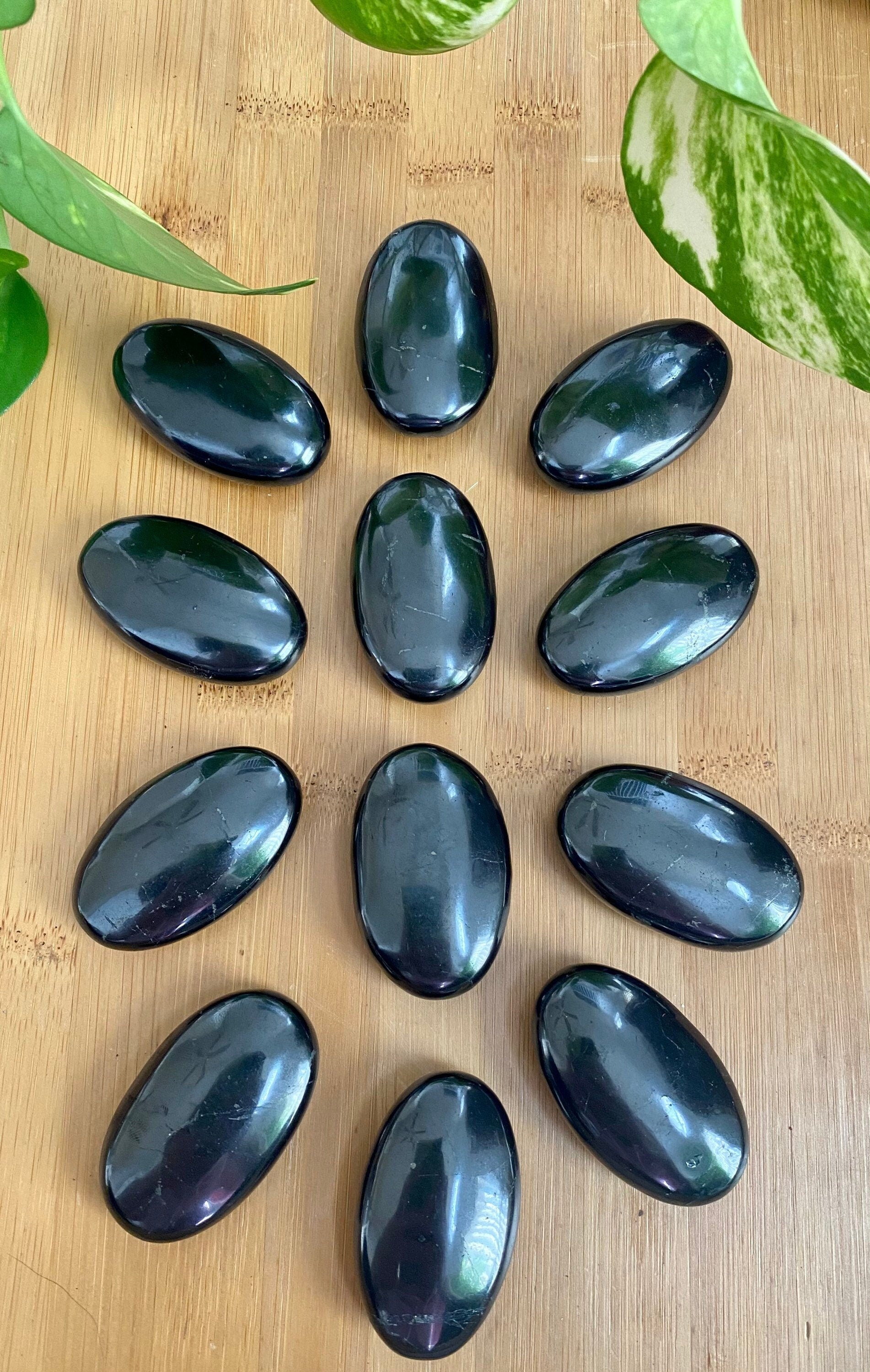 Shungite polished into palm stone shapes is perfect for a workspace or crystal healing.