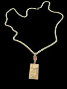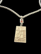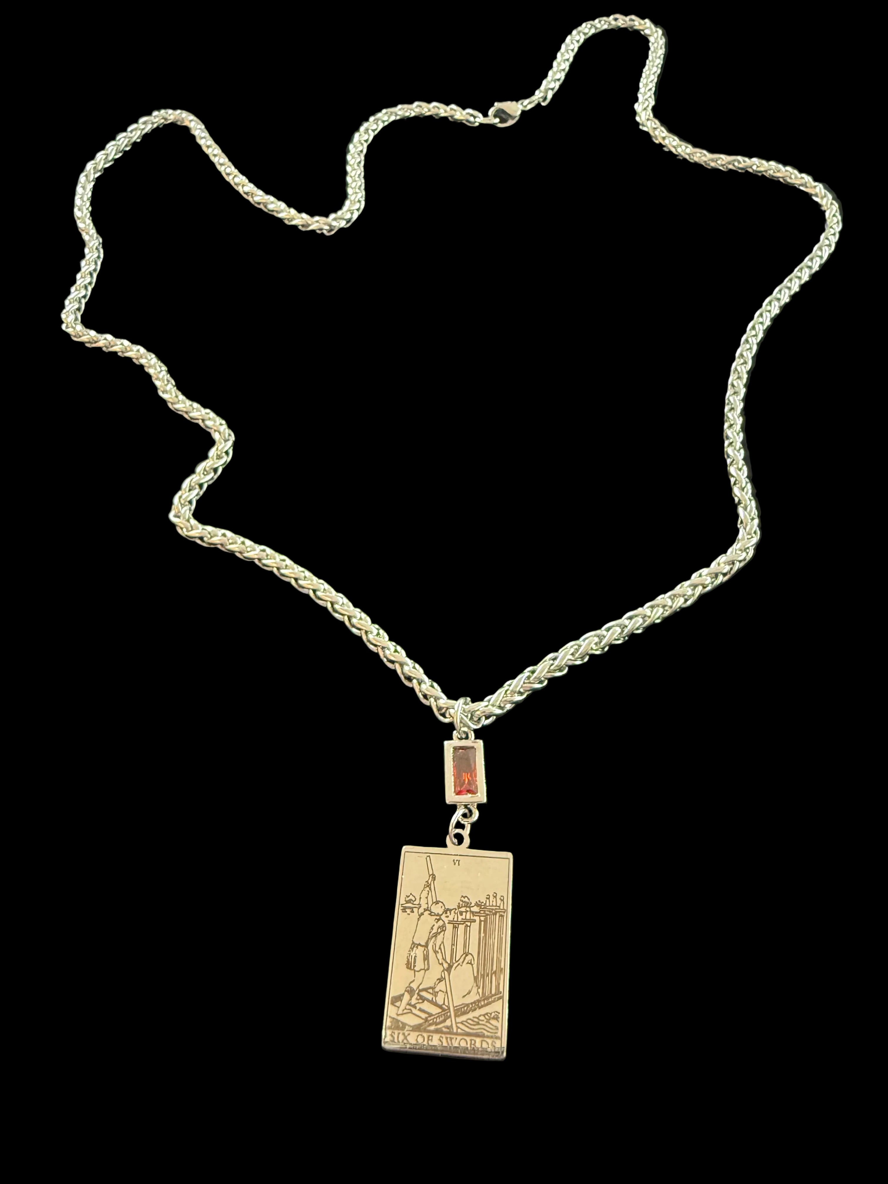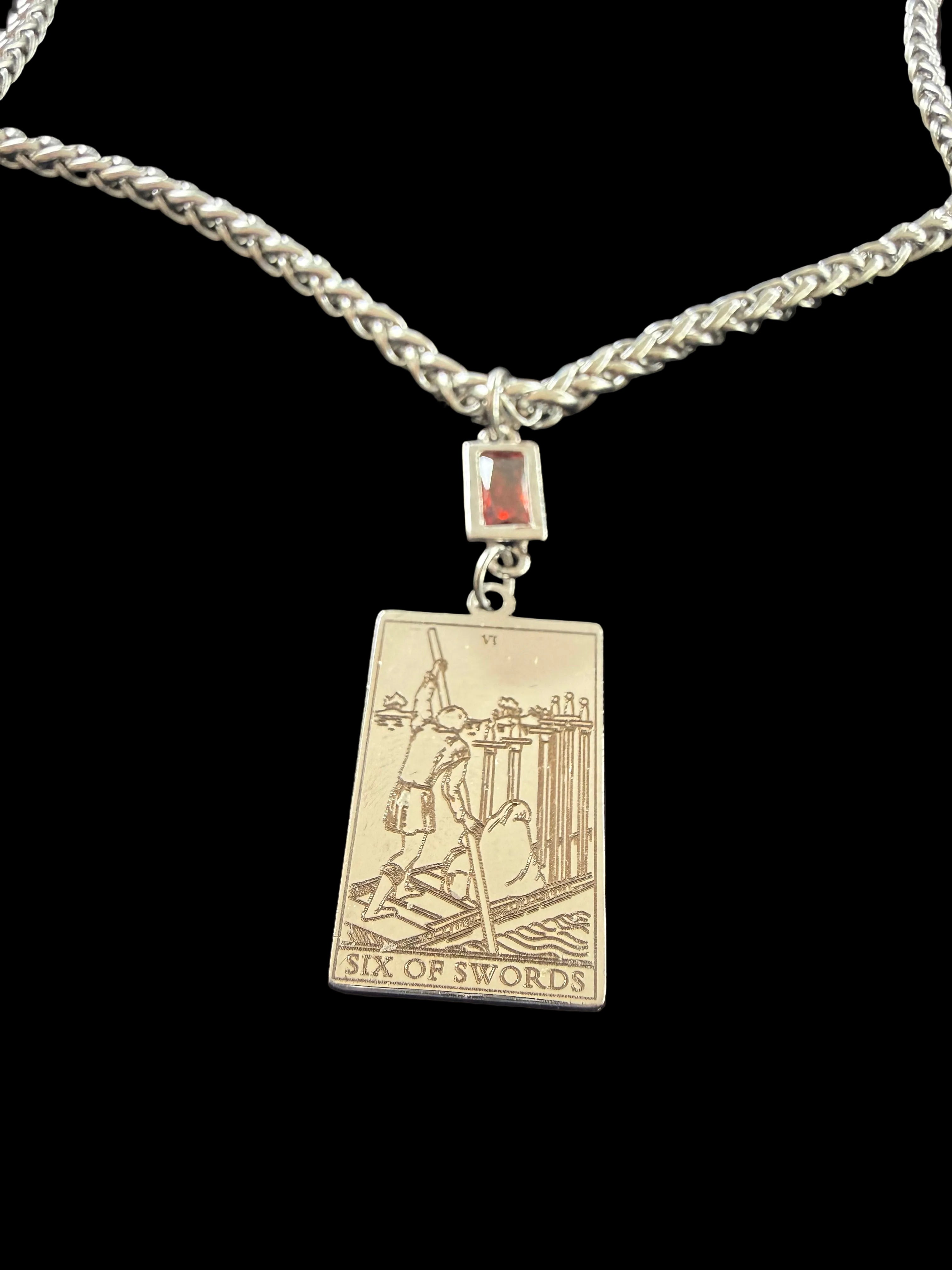This pendant features an engraved Six of Swords tarot design paired with a rectangular red crystal accent for a subtle yet powerful pop of color. The red stone adds depth and intensity, representing courage and forward movement during times of change.
