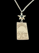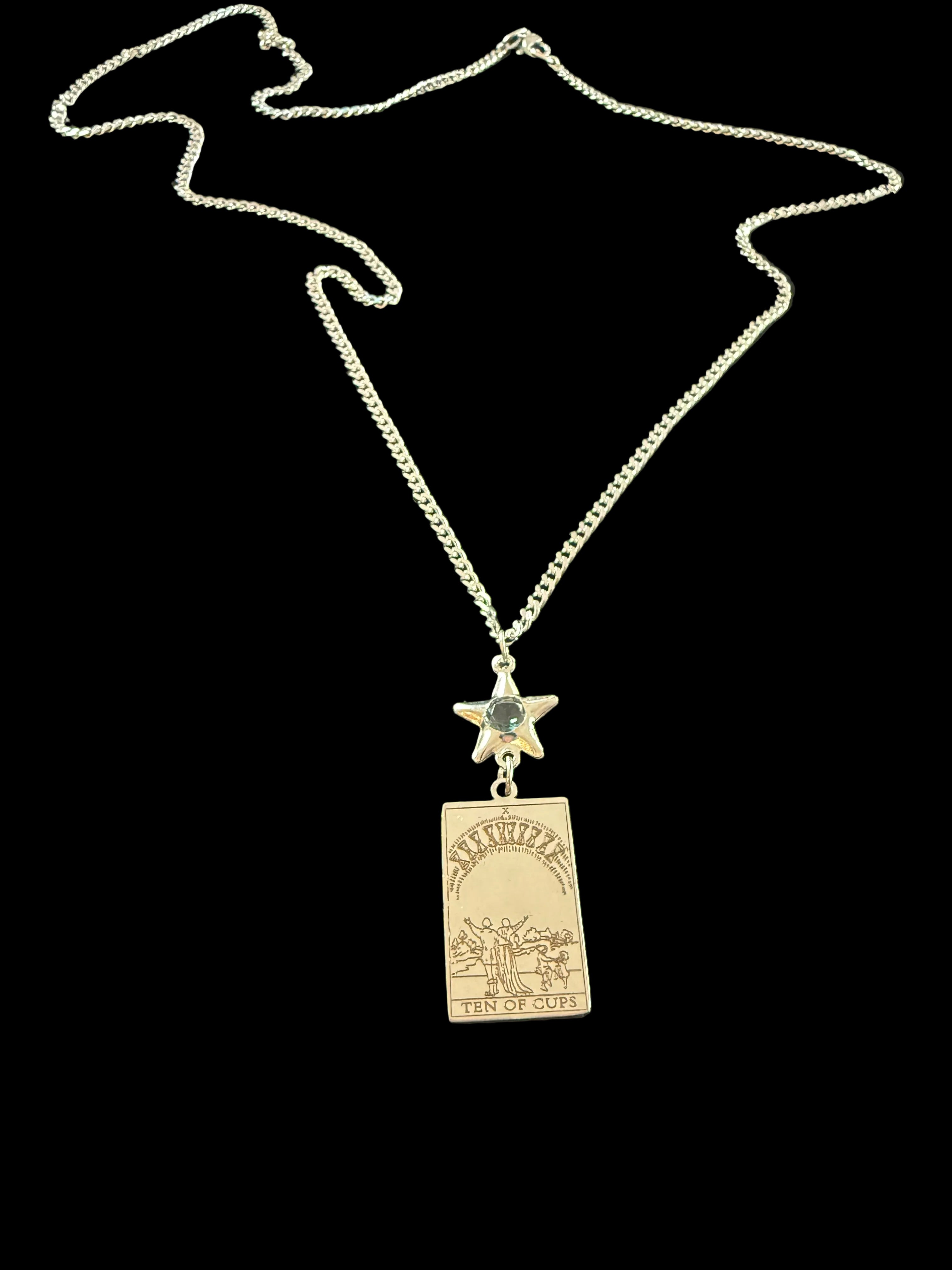 Featuring a detailed engraving of the Ten of Cups tarot card and accented with a star connector adorned with a stone, this piece symbolizes guidance from above and blessings unfolding in perfect timing.