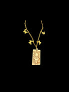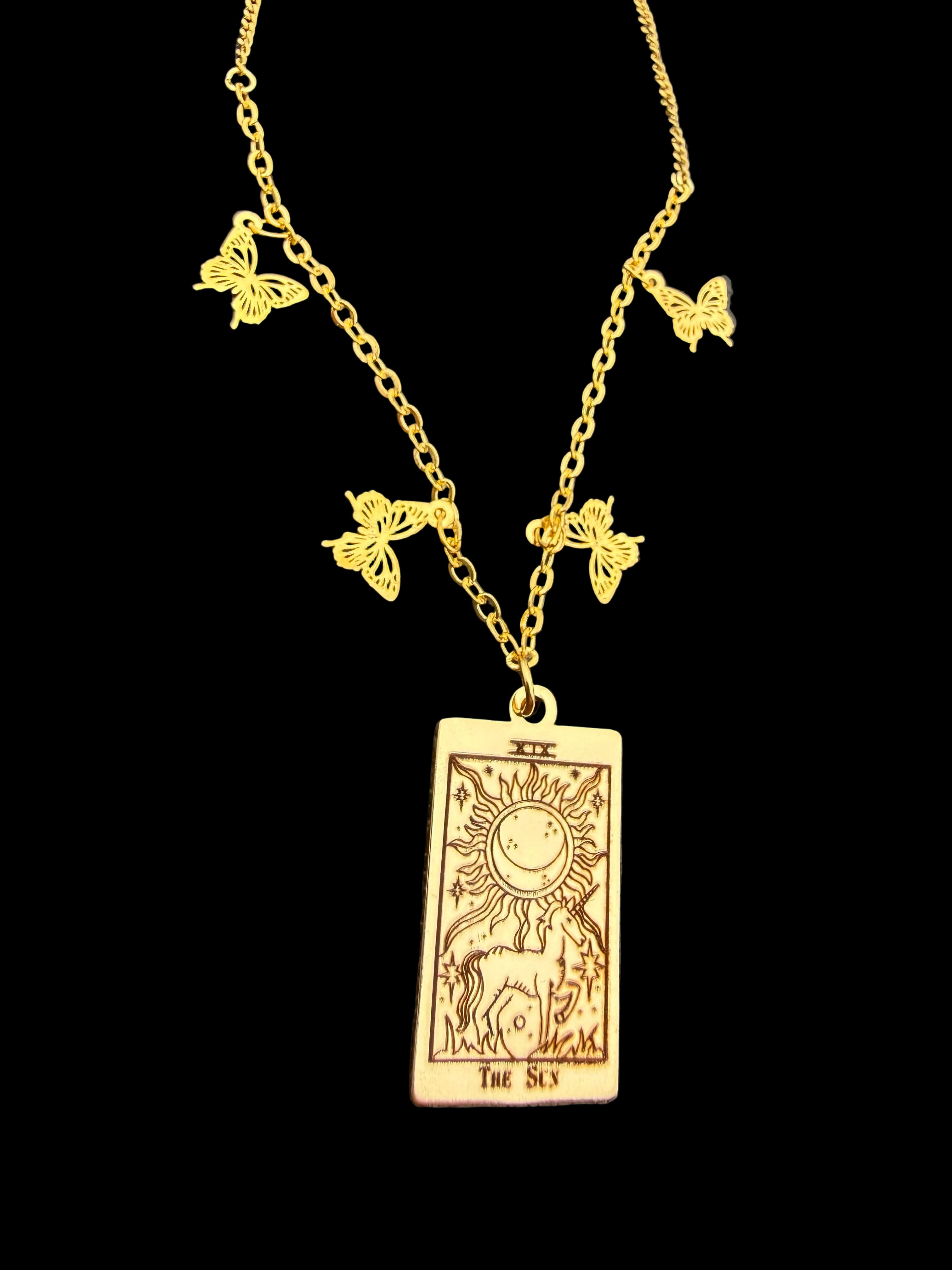 The Sun Tarot Butterfly Necklace features a detailed “The Sun” tarot card pendant on a gold-tone chain accented with delicate butterfly charms. Bright, confident, and high-frequency — this piece carries the energy of success, clarity, and divine joy.